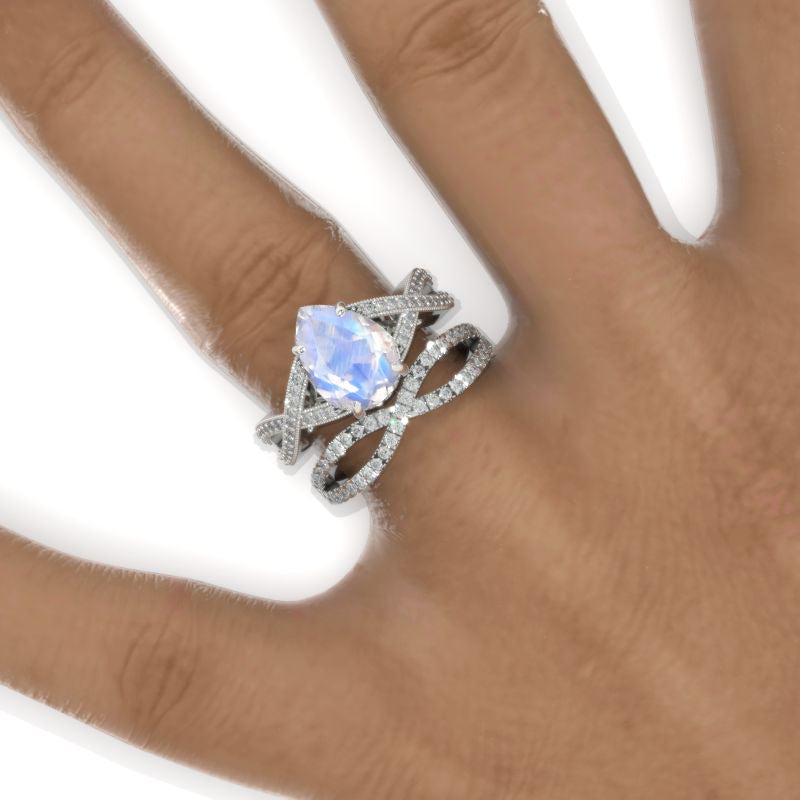3 Carat Pear Genuine Natural Moonstone Halo Twisted Engagement Ring 14K White Gold Ring Set