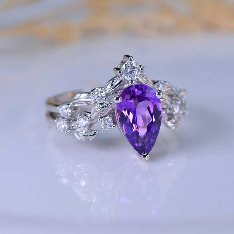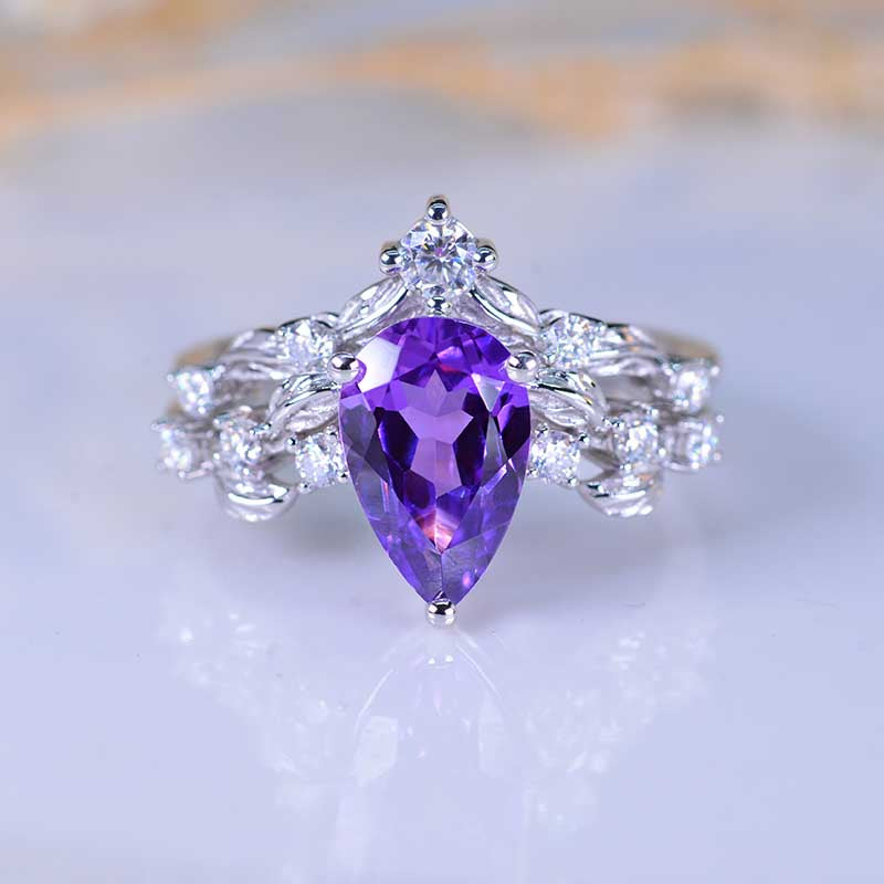 3 Carat Pear Purple Sapphire Halo Floral Engagement 14K White Gold Ring Eternity Ring Set