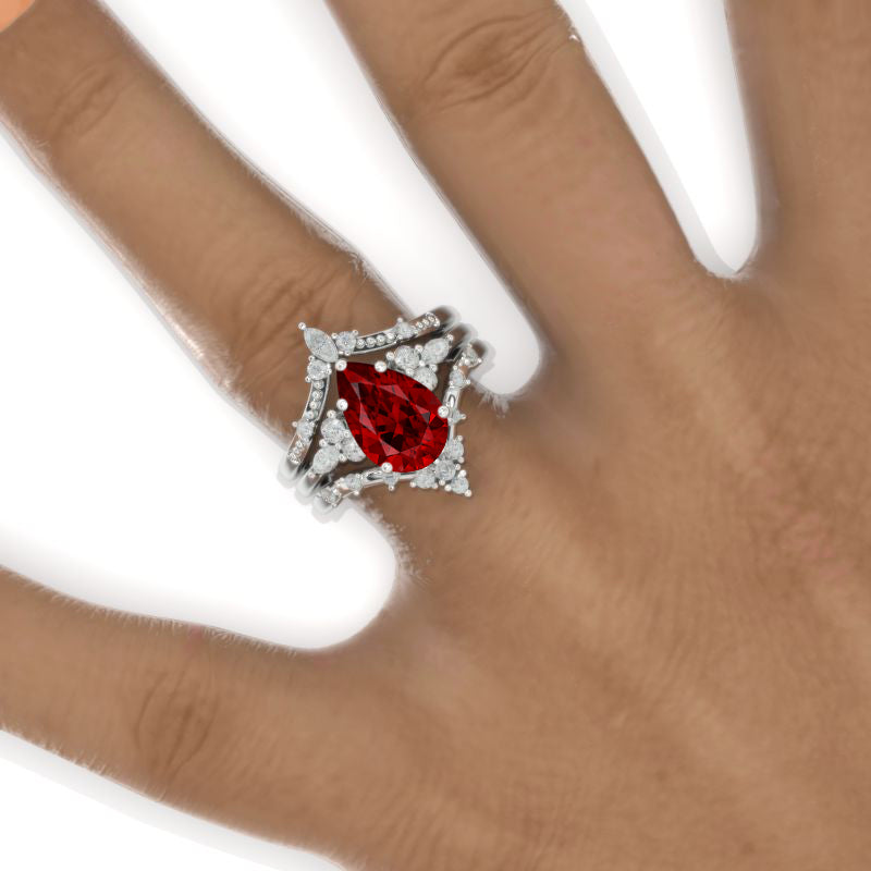 3 Carat Pear Ruby Floral Engagement 14K White Gold Ring Eternity Ring Set