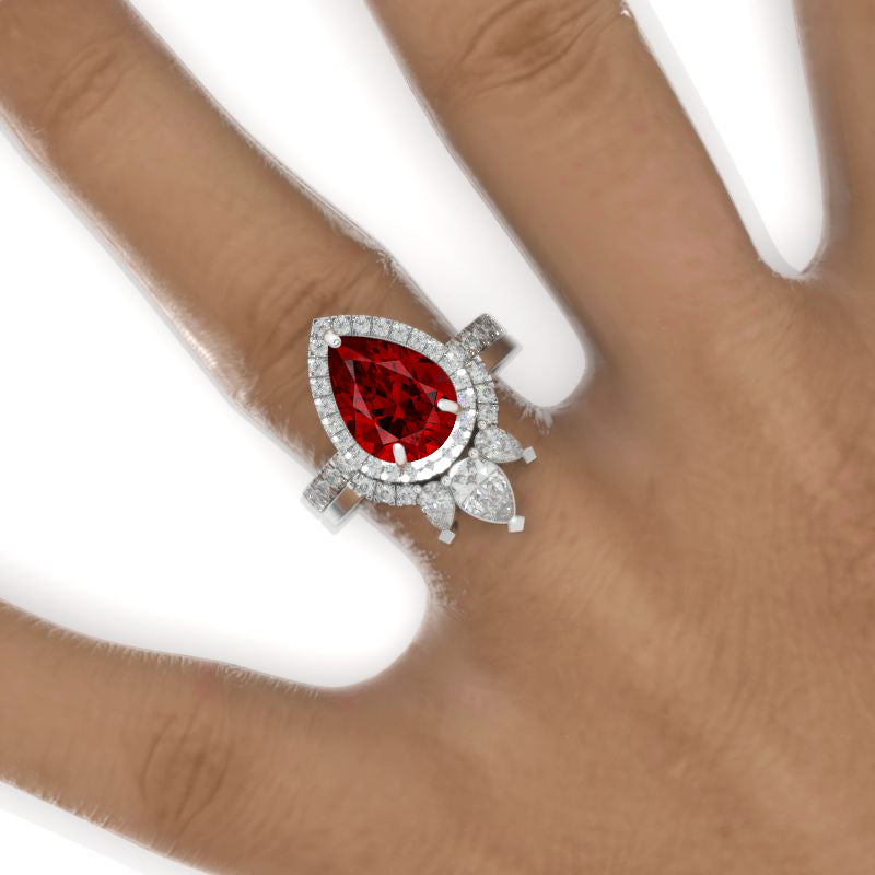 3 Carat Pear Ruby Halo Engagement Ring 14K White Gold Ring Set