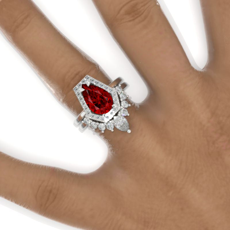 Engagement Ring : 3 Carat Ethically Lab-Grown Ruby AAA+ Grade Pear 11x7mm VG-Cut, Ex-Polish, VG-Symmetry Center Stone with 124 Colorless