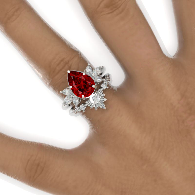 3 Carat Pear Ruby Halo Floral Engagement Ring 14K White Gold Ring Set