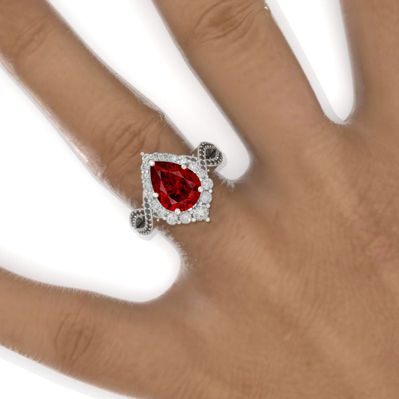 Engagement Ring: 3 Carat Ethically Lab-Grown Ruby AAA+ Grade Pear 11x7mm, VG-Cut, Ex-Polish, VG-Symmetry Center Stone with 124 Black Moissanites
