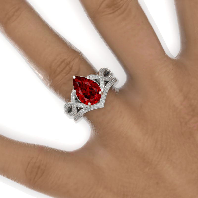 3 Carat Pear Ruby Twisted 14K White Gold Engagement Eternity Ring Set