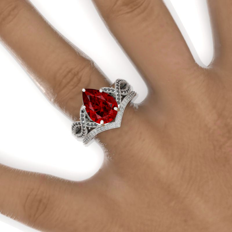 3 Carat Pear Ruby Twisted 14K White Gold Engagement Eternity Ring Set