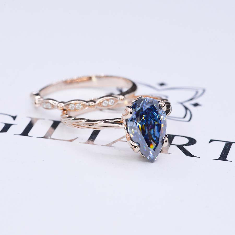 3 Carat Dark Gray-Blue Color Giliarto Moissanite Center Stone ( Pear 11x7mm, VVS1-Clarity, Ex-Cut, Ex-Polish, VG-Symmetry) with Eternity Bands in 14K Rose Gold.