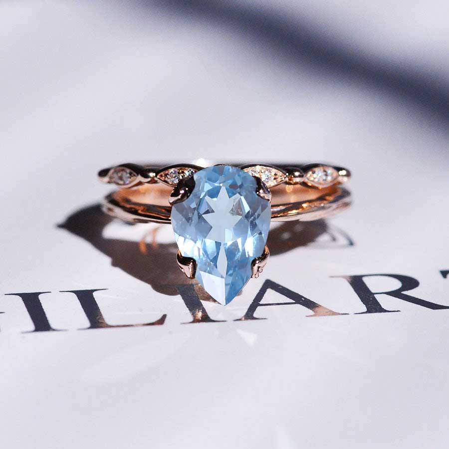 3 Carat Pear Shaped Genuine Natural Aquamarine Engagement Eternity Rose Gold Ring Set