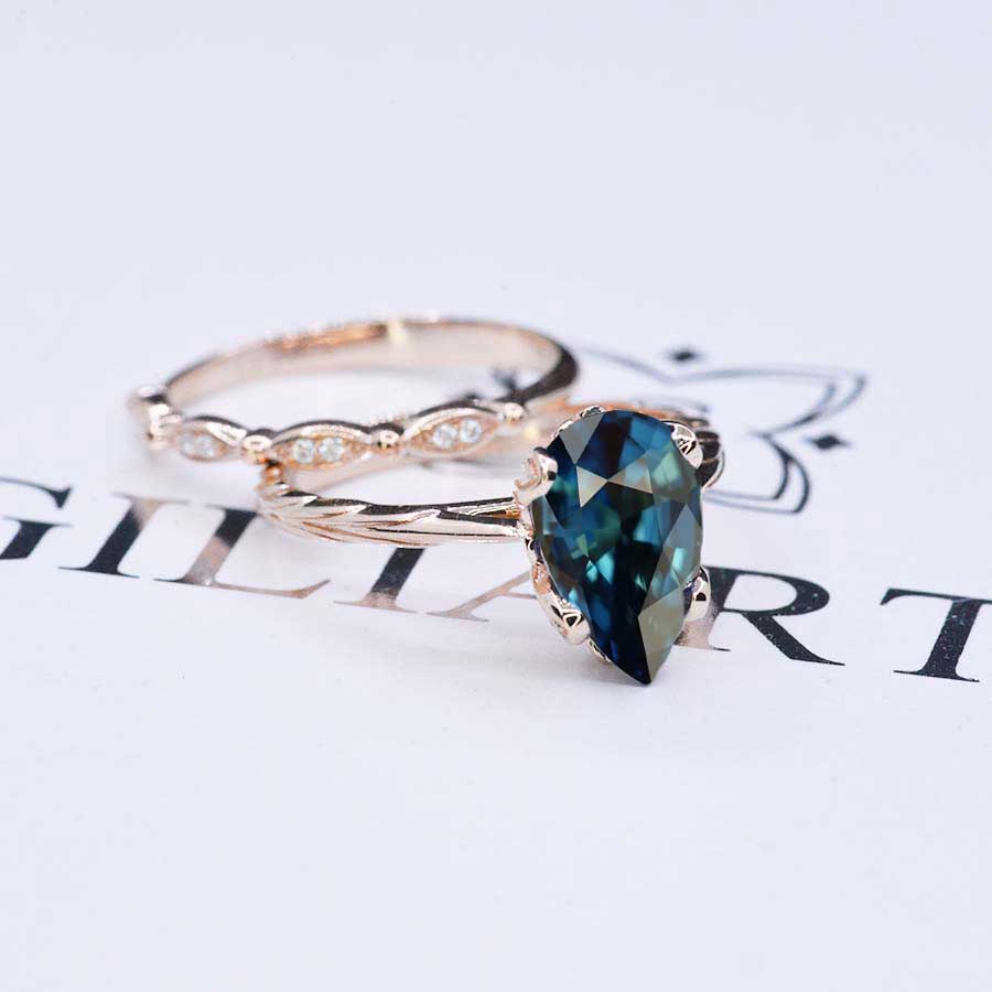 3 Carat Ethically Lab-Grown Teal Sapphire Center Stone ( Pear 11x7mm, VVS1-Clarity, Ex-Cut, Ex-Polish, VG-Symmetry) with Eternity Bands in 14K Rose Gold.