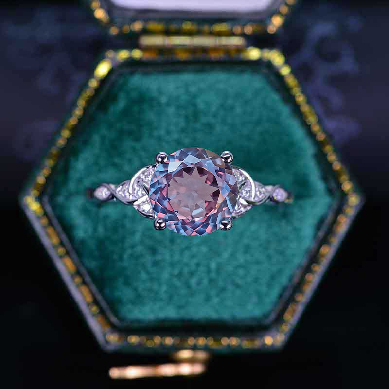 On the image featured Celtic round Portuguese Cut Ethically Lab-Grown Alexandrite 8mm,  VG-Symmetry  with - 0.1 CTW  Moissanite Accent Stones 14K White Gold  Ring.