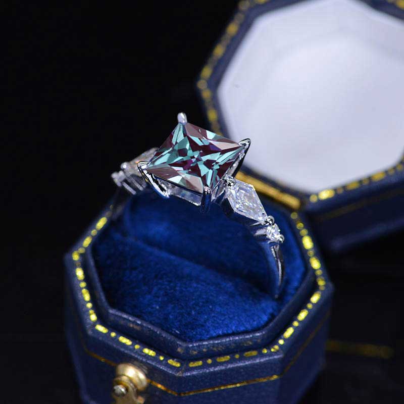 3 Carat Giliarto Ethically Lab-Grown Alexandrite Stones (Princess 8x8mm, Ex-Cut, Ex-Polish, VG-Symmetry) and Kite Accent Stones  (0.4 CTW D-Colorless, VVS1-Clarity) with  14K White  Gold.