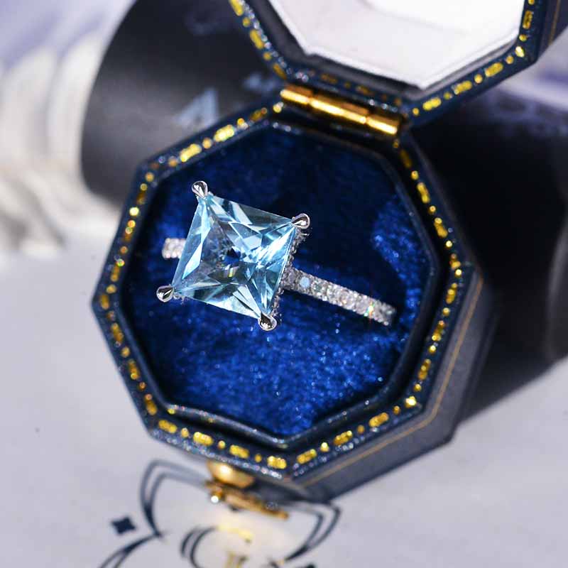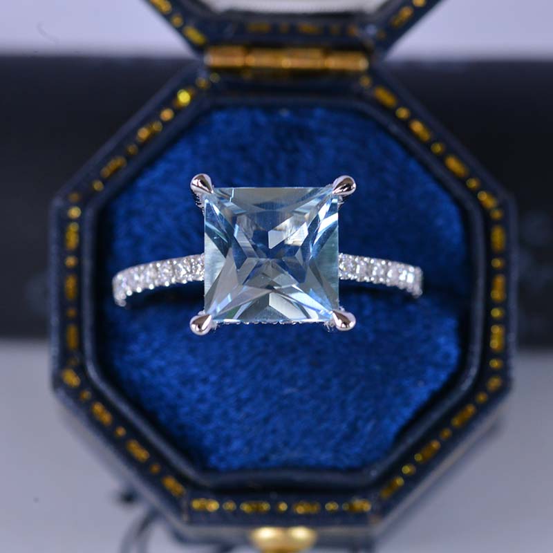 The default design option features 3 Carat Natural  Aquamarine  AAA+ Quality  8x8mm Princess Cut  Center Stone: VVS1-Clarity and Moissanite 0.3 CTW  D-Colorless, VVS1-Clarity, VG-Cut, Ex-Polish, VG-Symmetry Accent Stones (Colorless)