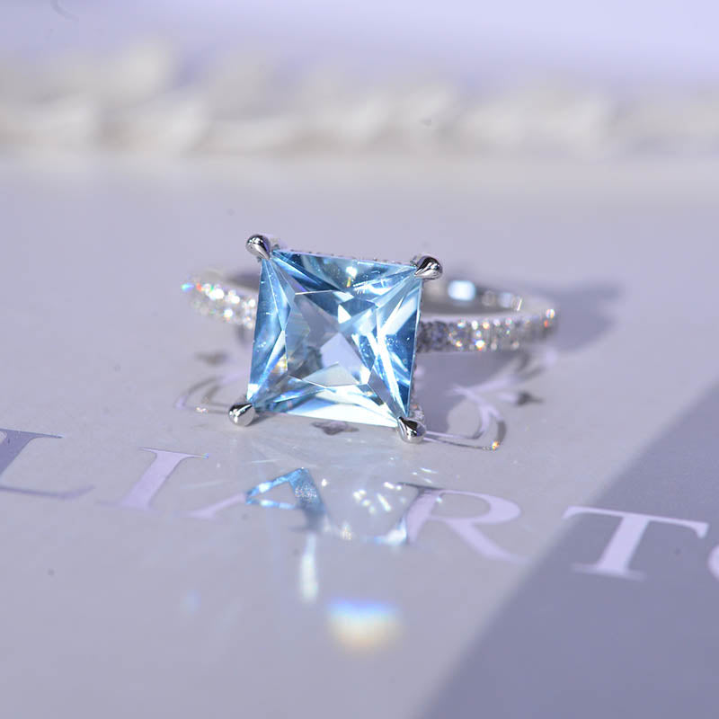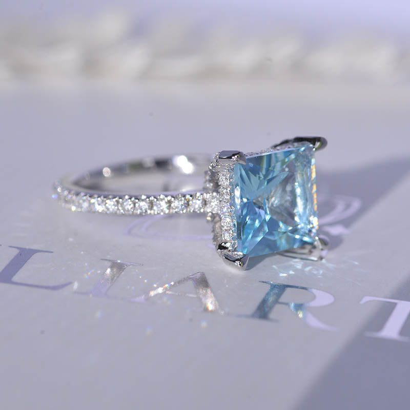 3 Carat Princess Cut Aquamarine Hidden Halo Gold Engagement Ring