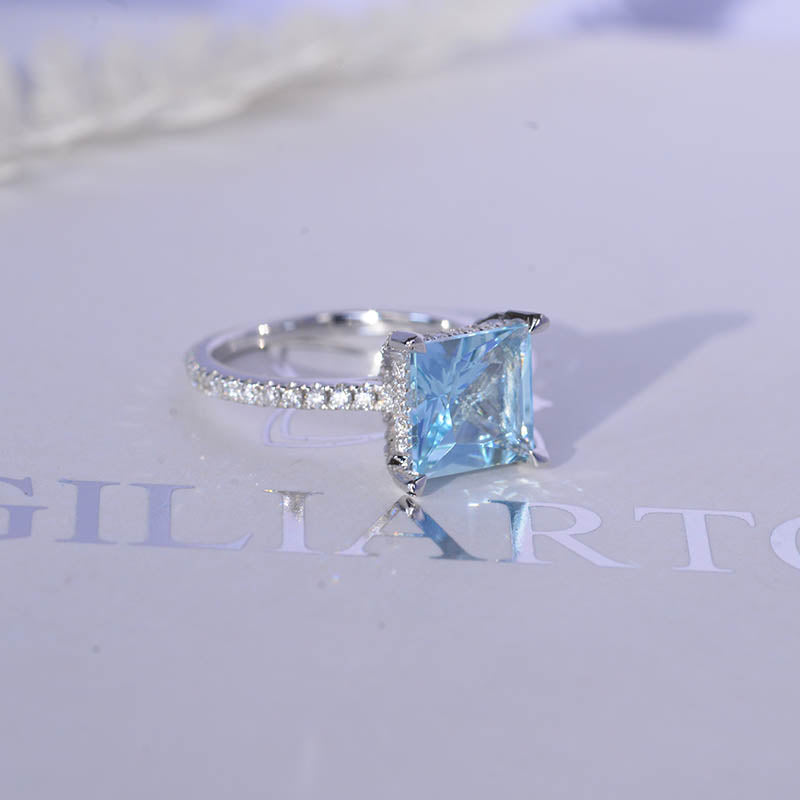 3 Carat Princess Cut Aquamarine Hidden Halo Gold Engagement Ring - Giliarto