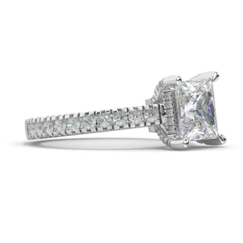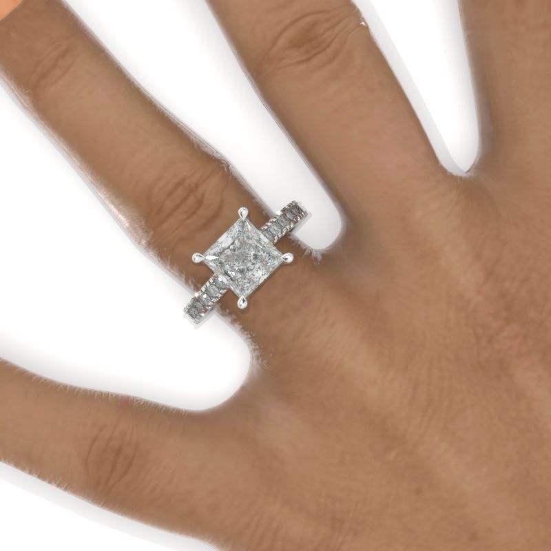 The default design option features 3 Carat Giliarto Moissanite 8x8mm Princess Cut Center Stone: D-Colorless VVS1-Clarity and 0.45 CTW D-Colorless, VVS1-Clarity, VG-Cut, Ex-Polish, VG-Symmetry Accent Stones (Colorless)