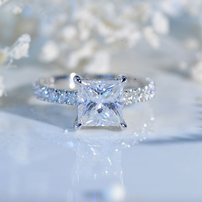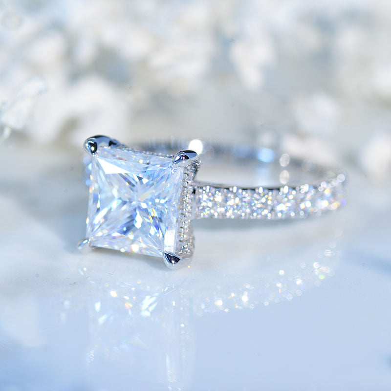 The default design option features 3 Carat Giliarto Moissanite 8x8mm Princess Cut Center Stone: D-Colorless VVS1-Clarity and 0.45 CTW D-Colorless, VVS1-Clarity, VG-Cut, Ex-Polish, VG-Symmetry Accent Stones (Colorless)