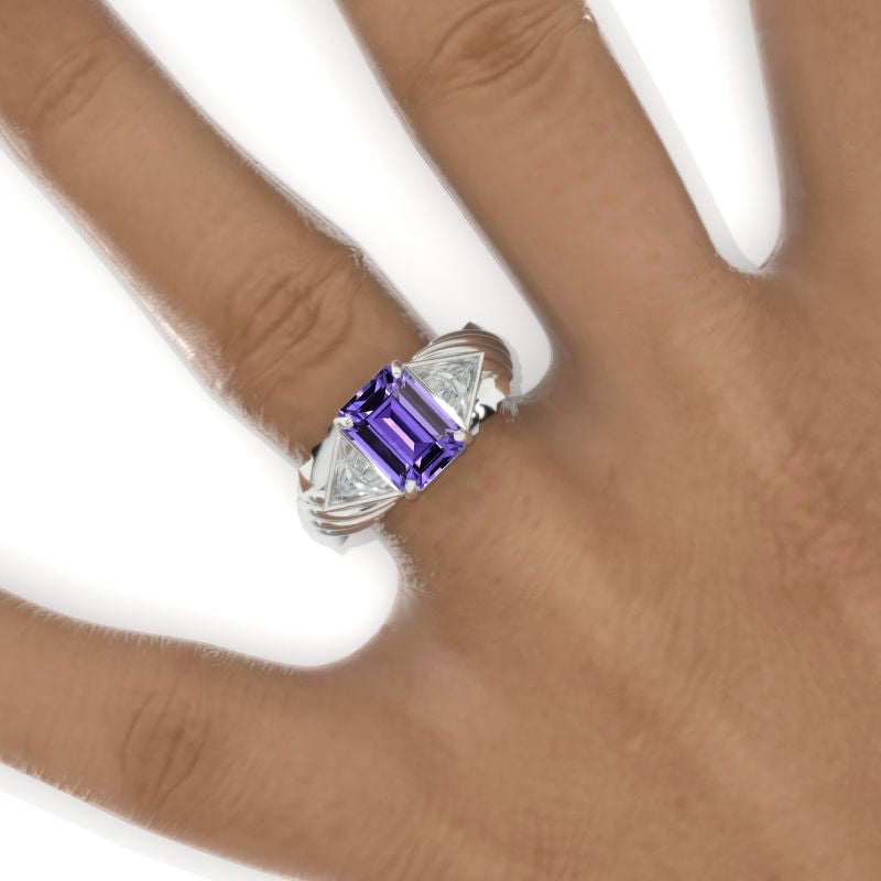 3 Carat Emerald Cut 9x7mm, Ethically Lab-Grown Purple Sapphire, Ex-Cut, Ex-Polish, VG-Symmetry and 2 Accents stones 1.8 CTW in 14K White Gold Men's Ring.