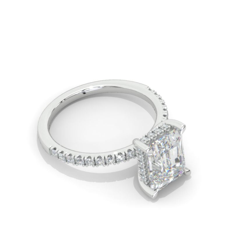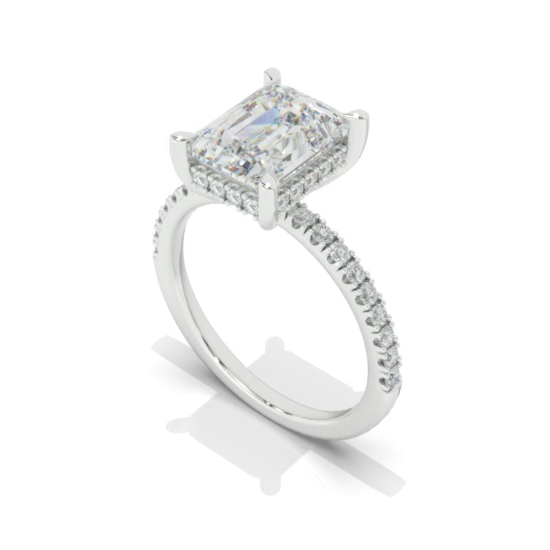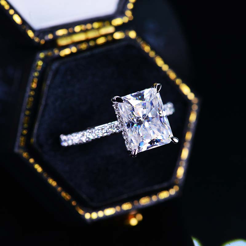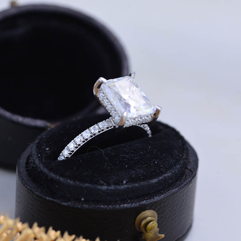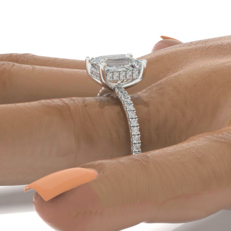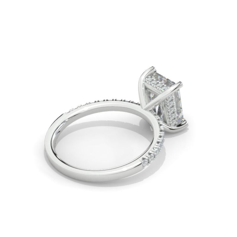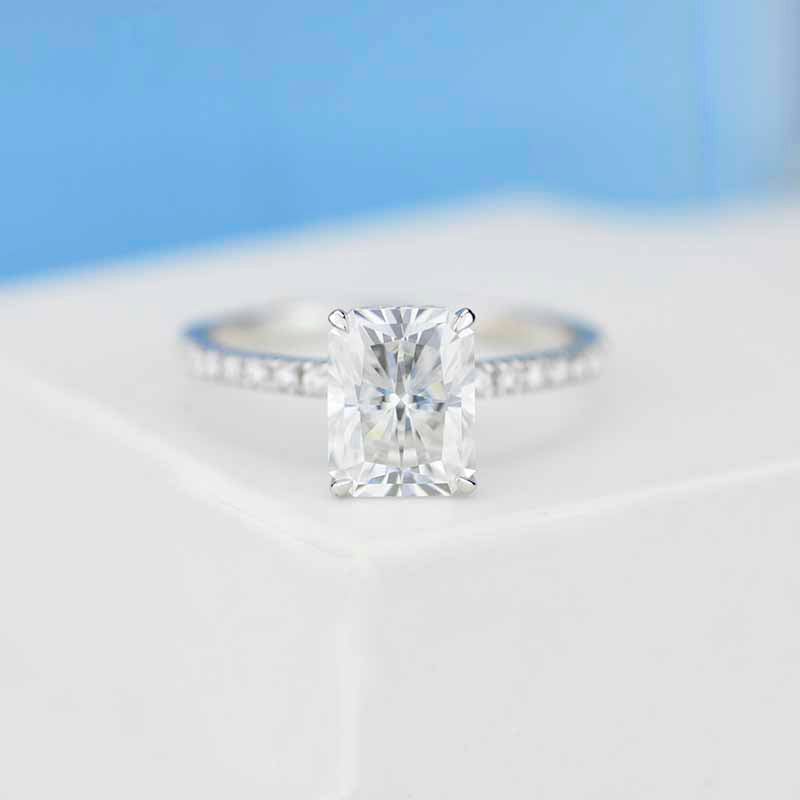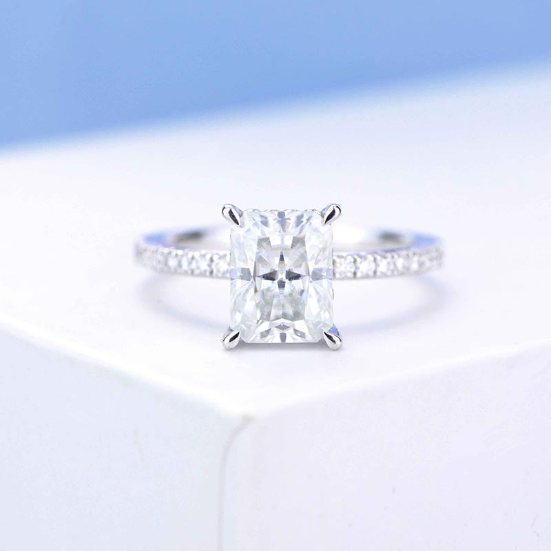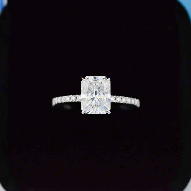 The design features approximately 3 Carat Giliarto Moissanite - Radiant 9x7mm