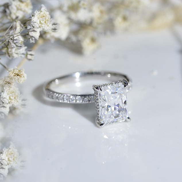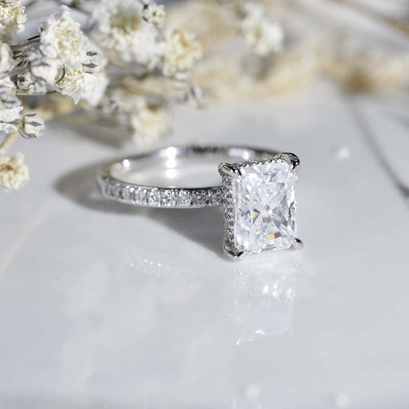 The design features approximately 3 Carat Giliarto Moissanite - Radiant 9x7mm