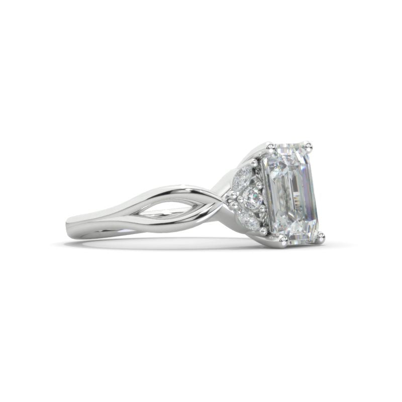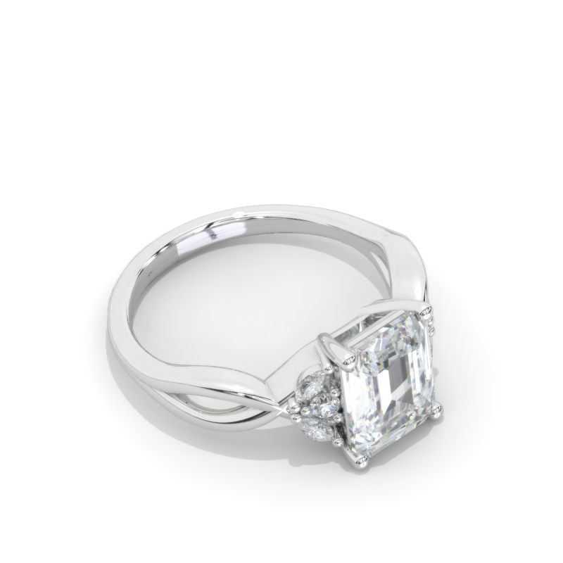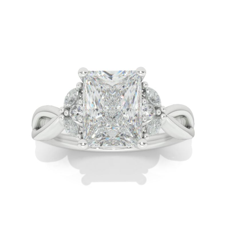The default design option features approximately 3+ Carat LAB-Grown Diamond Radiant Cut 9x7mm D-Colorless, VVS1-Clarity, VG-Cut, Ex-Polish, VG-Symmetry Center Stone Set with Colorless LAB-Grown Diamond Accent stones