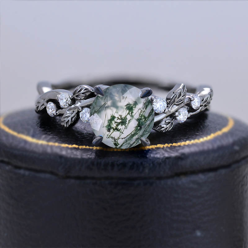 3 Carat Round Brilliant Cut Genuine Moss Agate Floral Black Gold Engag - Giliarto