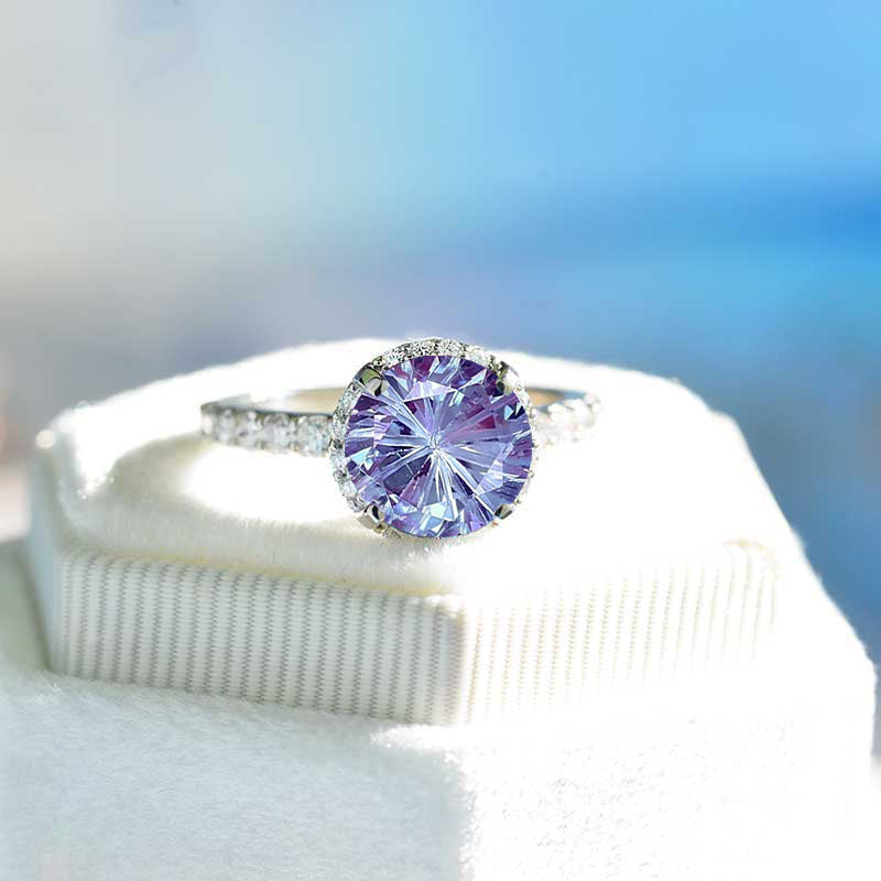 3 Carat Fireworks Cut Ethically Lab-Grown Alexandrite Round 9mm, VG-Cut, Ex-Polish, VG-Symmetry Center Stone with 30 Colorless 0.4 CTW Moissanite  (D-Colorless, VVS1 clarity) Accent Stones 14K White Gold Ring.