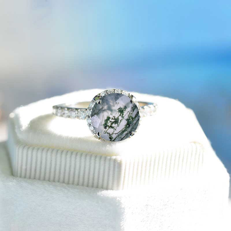 3 Carat Round Genuine Moss Agate Halo Gold Engagement Ring Model 541-9 - Giliarto