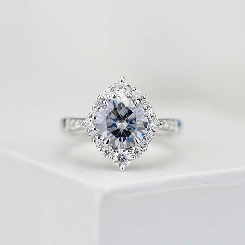 3 Carat Dark Gray Blue Moissanite Round  9mm  VVS1-Clarity, VG-Cut, Ex-Polish, VG-Symmetry Center Stone with 30 Colorless 0.8 CTW Moissanite (D-Colorless, VVS1 clarity) Accent Stones 14K White Gold Ring.