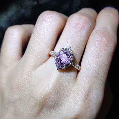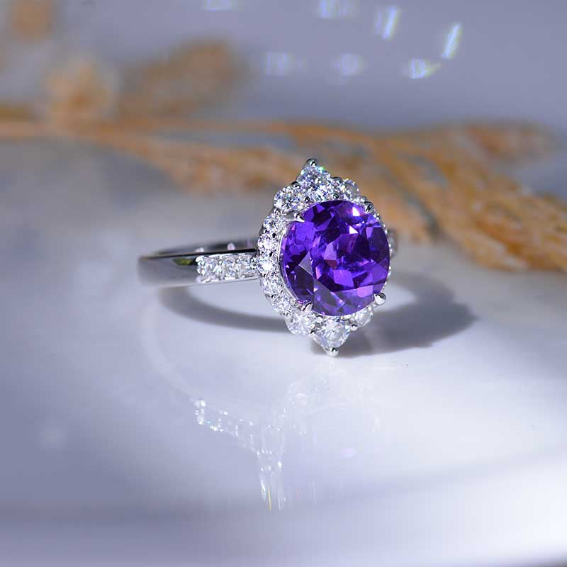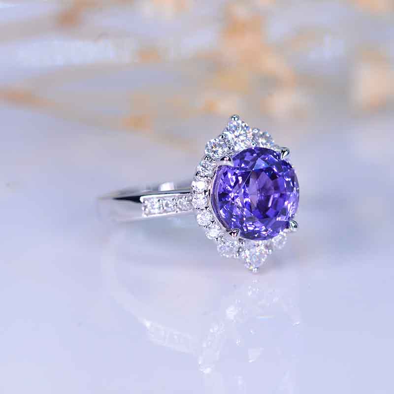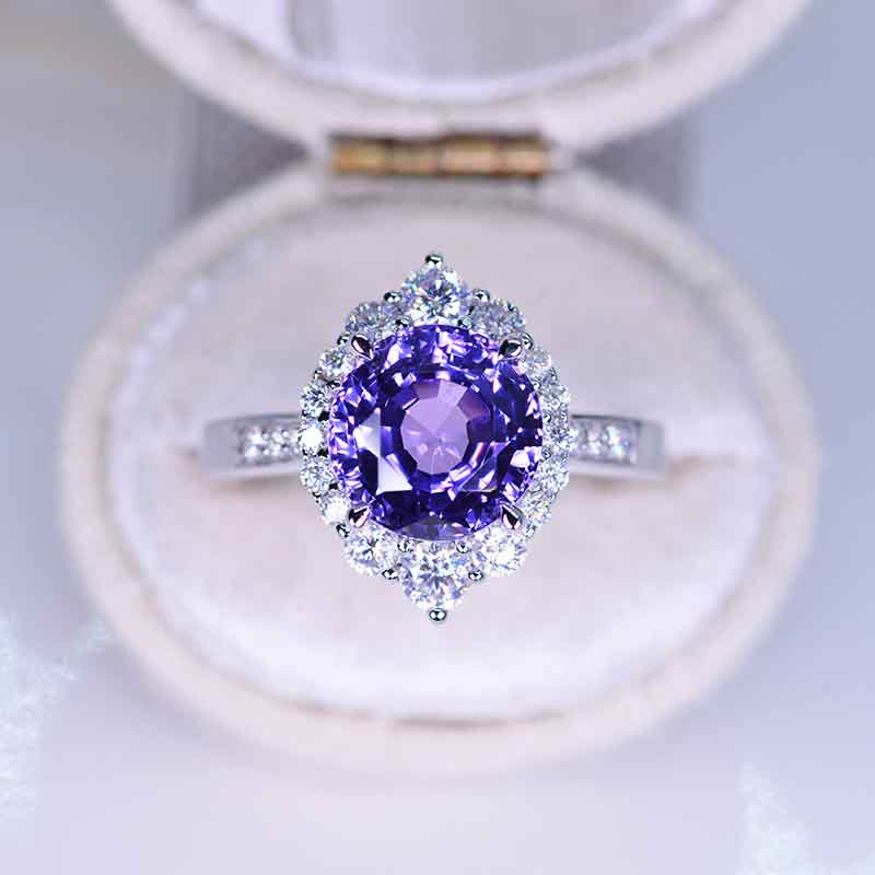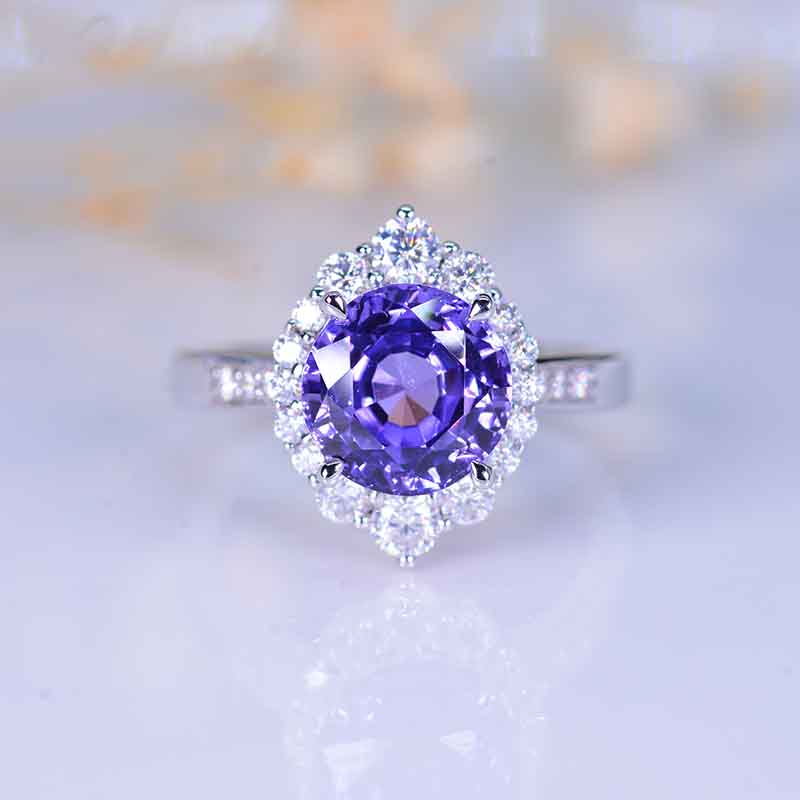 3 Carat Ethically Lab-Grown Purple Sapphire  Round  9mm  VVS1-Clarity, VG-Cut, Ex-Polish, VG-Symmetry Center Stone with 30 Colorless 0.8 CTW Moissanite (D-Colorless, VVS1 clarity) Accent Stones 14K White  Gold  Ring.