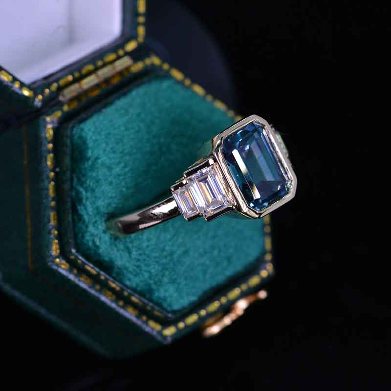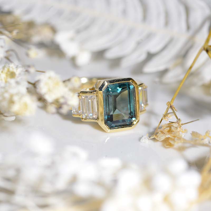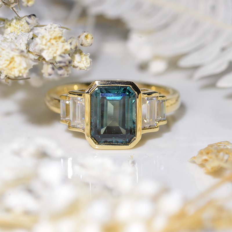 3 Carat Teal Sapphire Emerald Cut Bezel Set Teal Sapphire Five-Stone 14K Yellow Engagement Ring