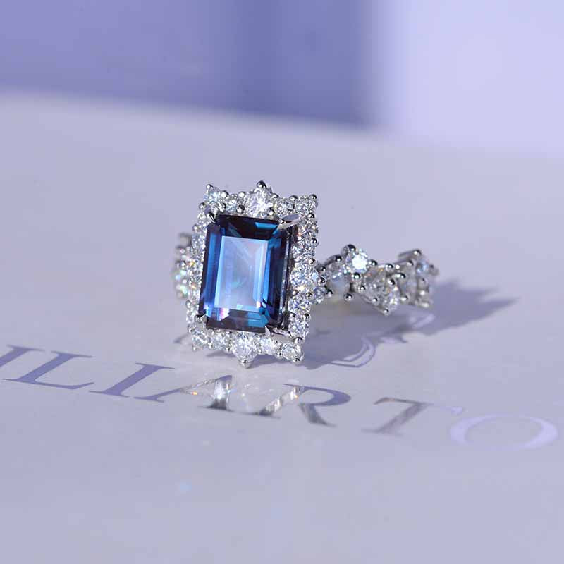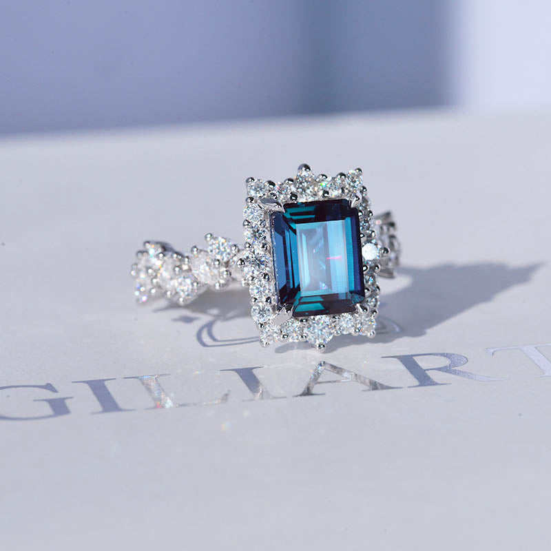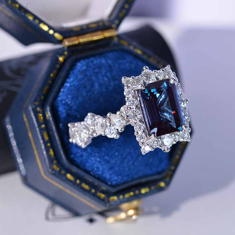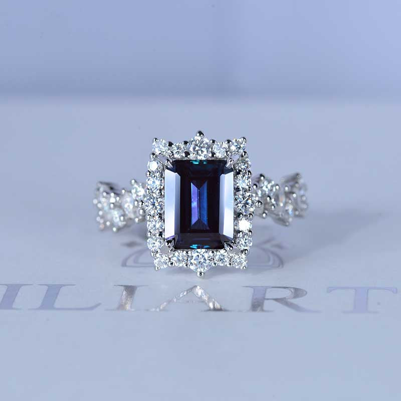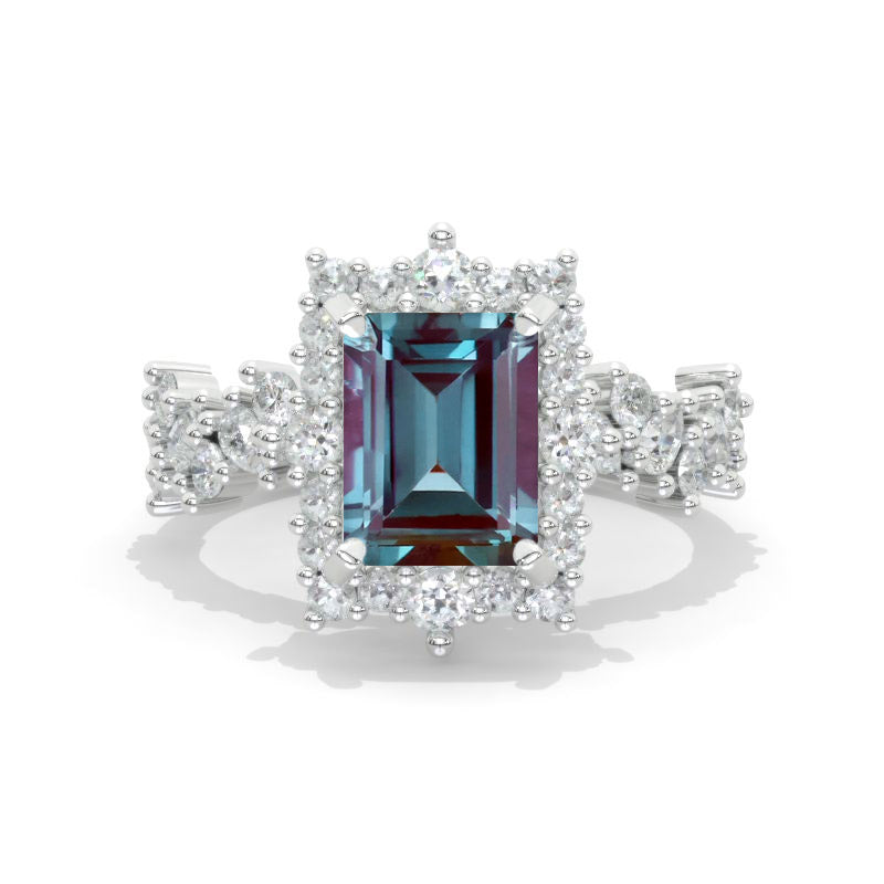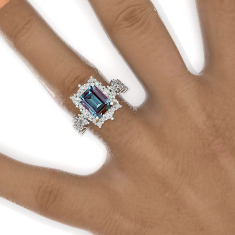 The default design option features 3 Carat 9x7mm Emerald Cut Ethically LAB-Grown Alexandrite Center Stone set with 1.2 CTW Accent Stone: D-Colorless, VVS1-Clarity, VG-Cut, Ex-Polish, VG-Symmetry