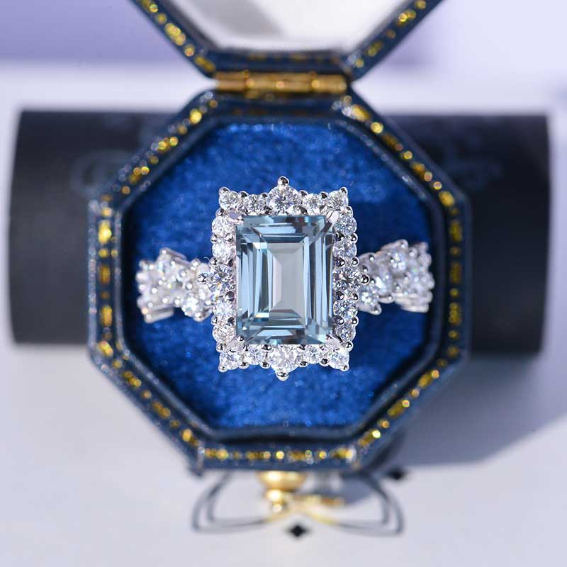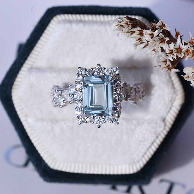 The default design option features 3 Carat 9x7mm Emerald Natural Genuine Aquamarine AAA+ Quality Center Stone set with 1.2 CTW Accent Stone: Moissanite D-Colorless, VVS1-Clarity, VG-Cut, Ex-Polish, VG-Symmetry