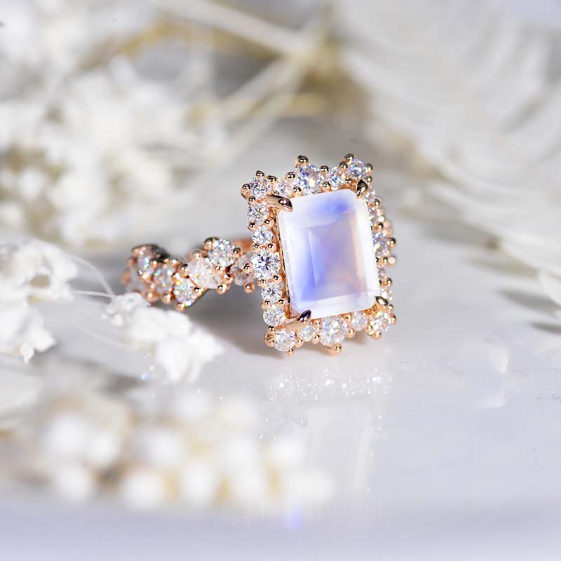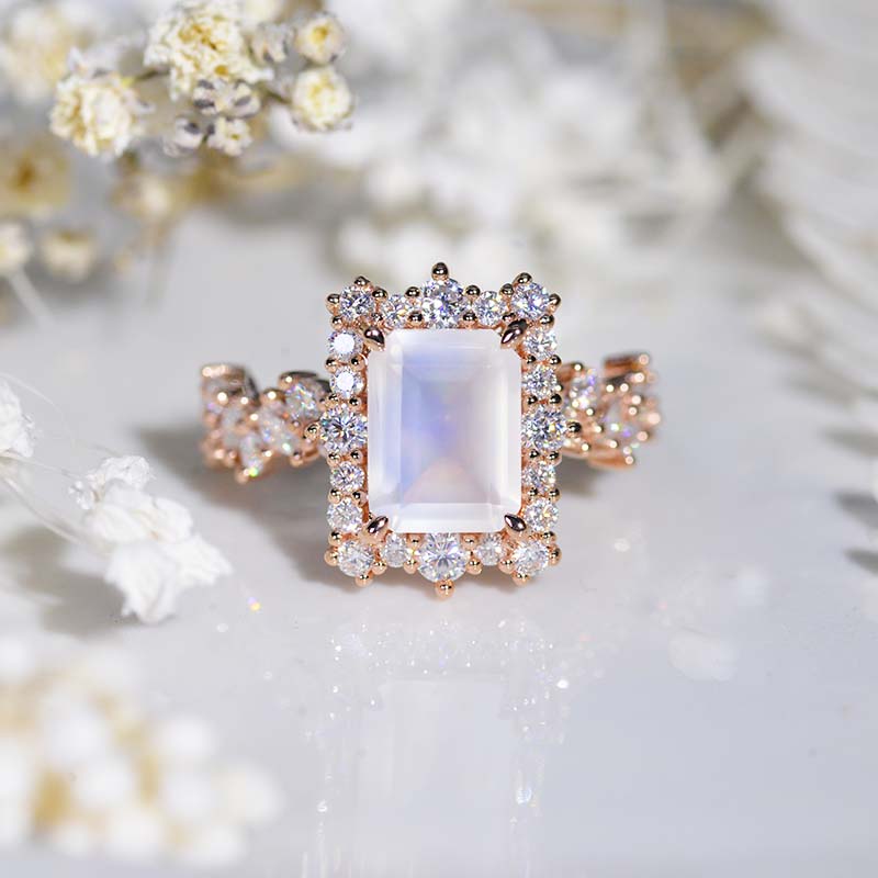 3 Carat Vintage Style 9x7mm Emerald Cut Halo Natural Moonstone Rose Go - Giliarto