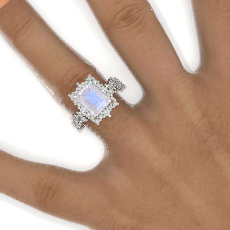 The default design option features 3 Carat 9x7mm Emerald Cut Natural Moonstone Center Stone set with 1.2 CTW Accent Stone: VG-Cut, Ex-Polish, VG-Symmetry