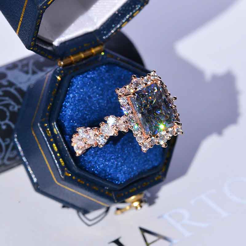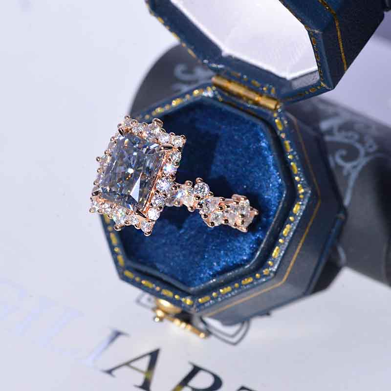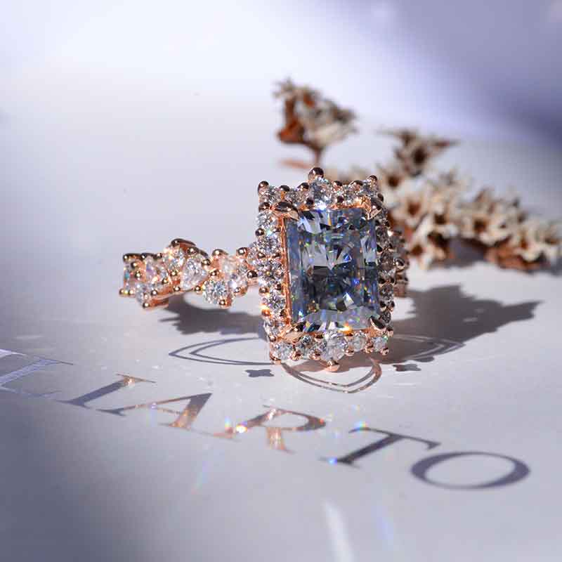 The default design option features 3 Carat 9x7mm Radiant Cut Giliarto Gray Moissanite Center Stone set with 1.2 CTW Accent Stone: D-Colorless, VVS1-Clarity, VG-Cut, Ex-Polish, VG-Symmetry