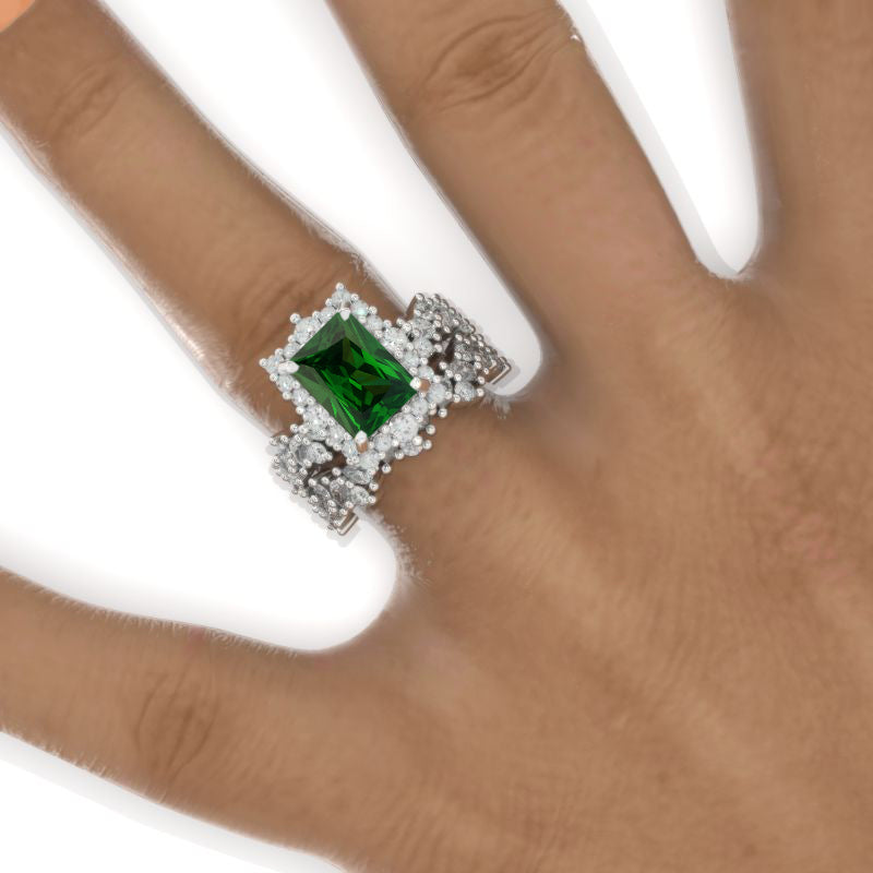 The default design option features 3 Carat 9x7mm Radiant Cut Emerald Center Stone set with 1.2 CTW Accent Stone: D-Colorless, VVS1-Clarity, VG-Cut, Ex-Polish, VG-Symmetry
