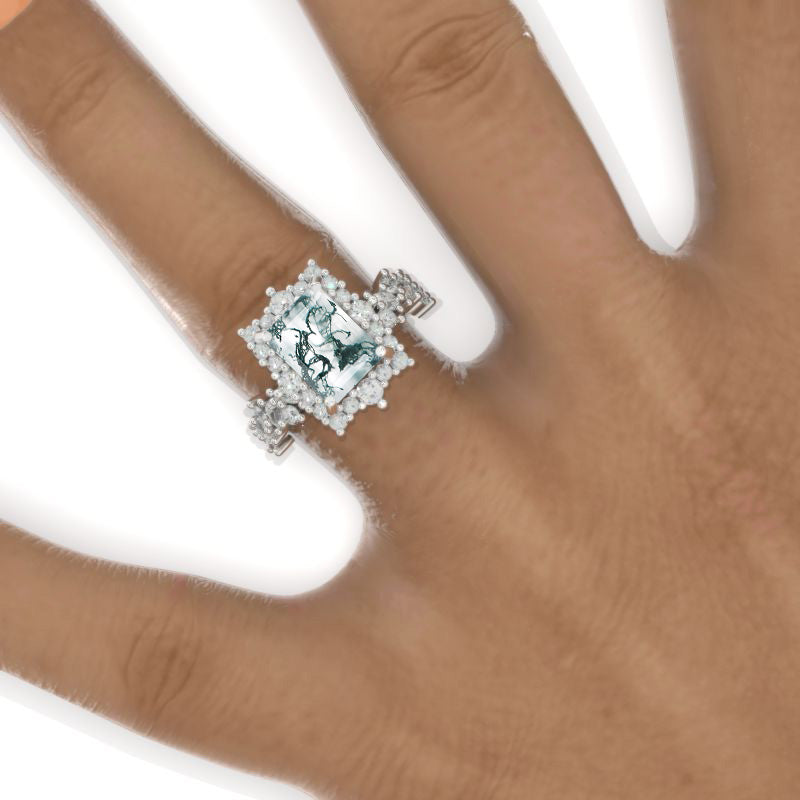 The default design option features 3 Carat 9x7mm Radiant Cut Genuine Moss AgateCenter Stone set with 1.2 CTW Accent Stone: D-Colorless, VVS1-Clarity, VG-Cut, Ex-Polish, VG-Symmetry