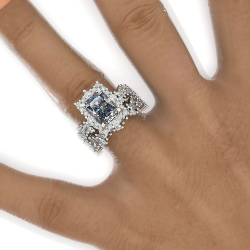 The default design option features 3 Carat 9x7mm Radiant Cut Giliarto Gray Moissanite Center Stone set with 1.2 CTW Accent Stone: D-Colorless, VVS1-Clarity, VG-Cut, Ex-Polish, VG-Symmetry