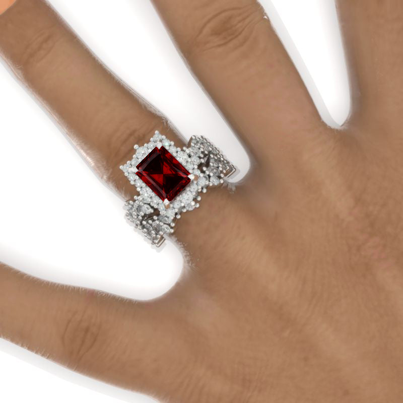 The default design option features 3 Carat 9x7mm Radiant Cut Ethically Lab-Grown Ruby AAA+ Grade Center Stone set with 1.2 CTW Accent Stone: D-Colorless, VVS1-Clarity, VG-Cut, Ex-Polish, VG-Symmetry