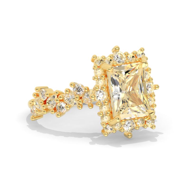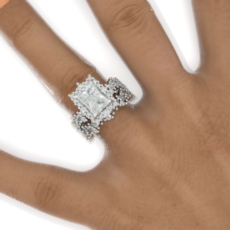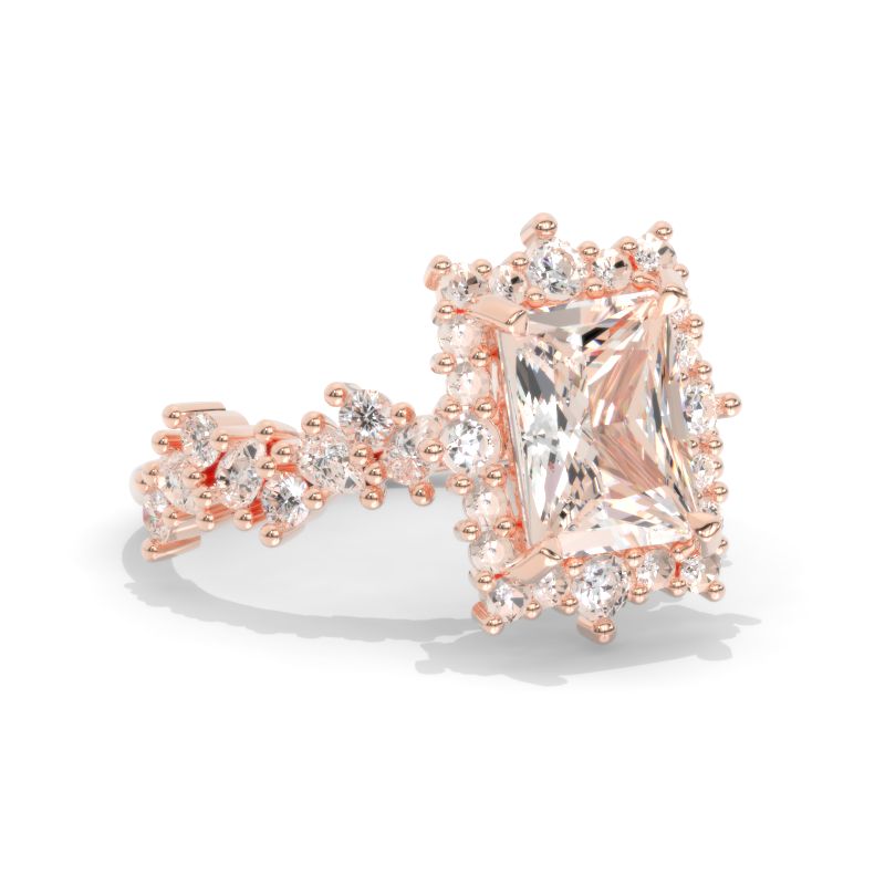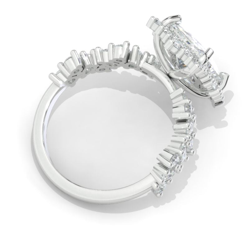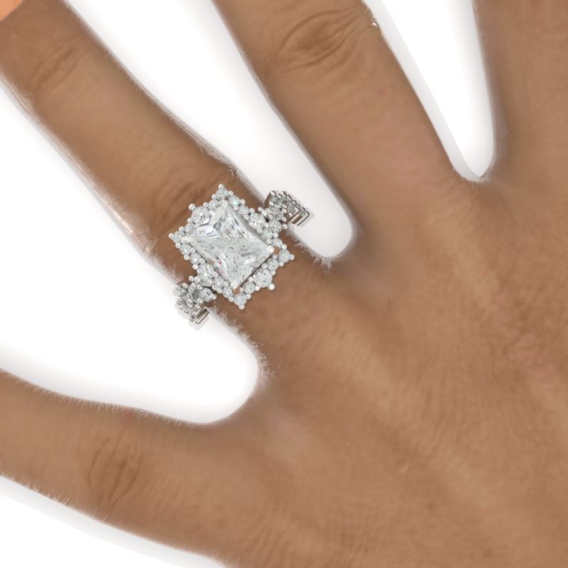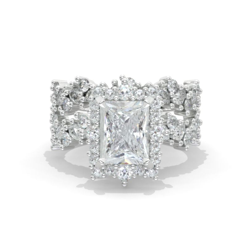 The default design option features Approximately 3+ Carat 9x7mm Radiant Cut LAB-Grown DiamondCenter Stone set with 1.2 CTW Accent Stone: D-Colorless, VVS1-Clarity, VG-Cut, Ex-Polish, VG-Symmetry