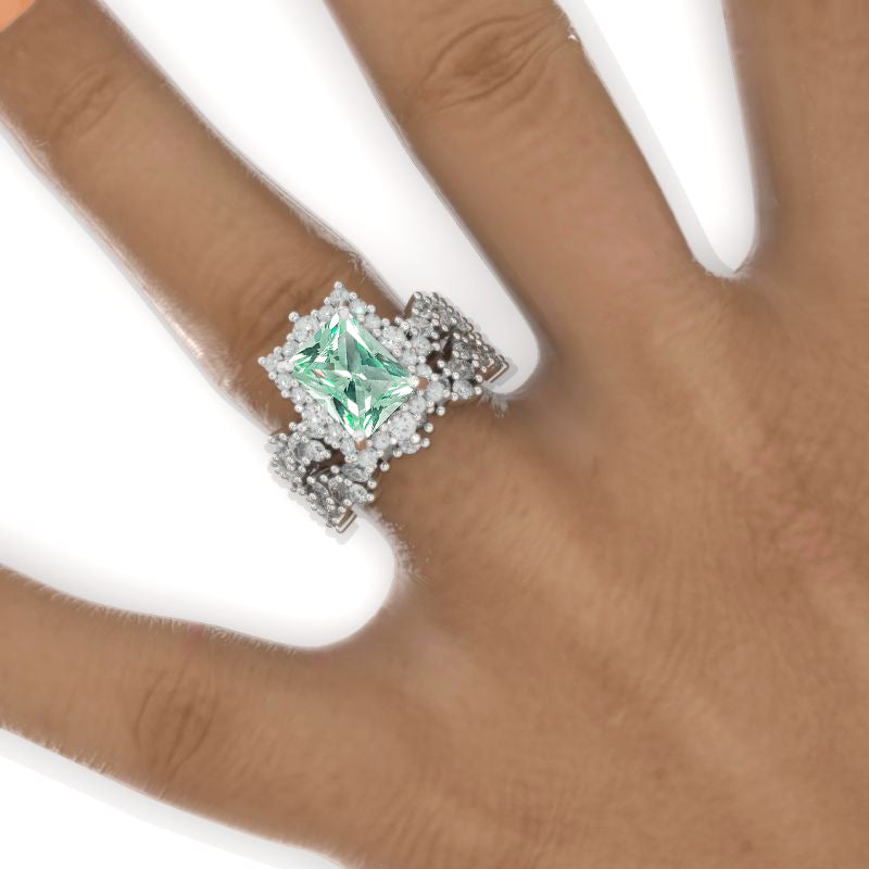 The default design option features 3 Carat 9x7mm Radiant Cut Ethically Lab-Grown Mint Sapphire Center Stone set with 1.2 CTW Accent Stone: D-Colorless, VVS1-Clarity, VG-Cut, Ex-Polish, VG-Symmetry