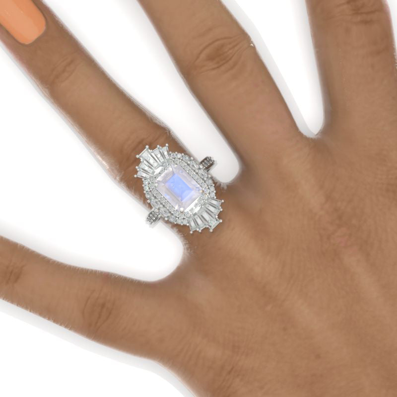 The default design option features 3 Carat Genuine Natural Moonstone 9x7mm Emerald Cut Center Stone