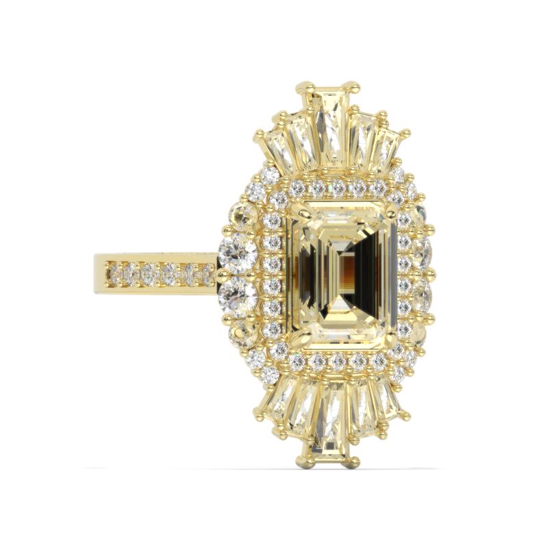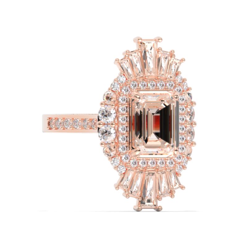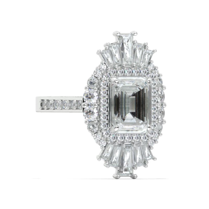 The default design option features Approximately 3+ Carat LAB-Grown Diamond 9x7mm Emerald Cut Center Stone, D-Colorless, VVS1-Clarity, VG-Cut, Ex-Polish, VG-Symmetry