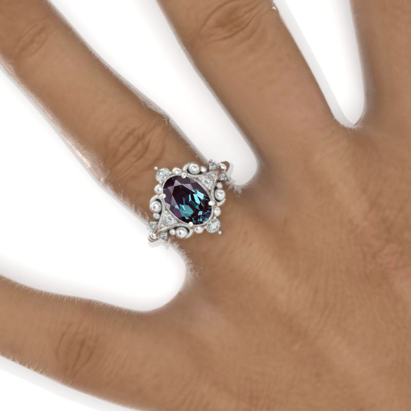 3 CT Oval Halo Alexandrite Vintage Wedding Ring. 14K White Gold Engage - Giliarto
