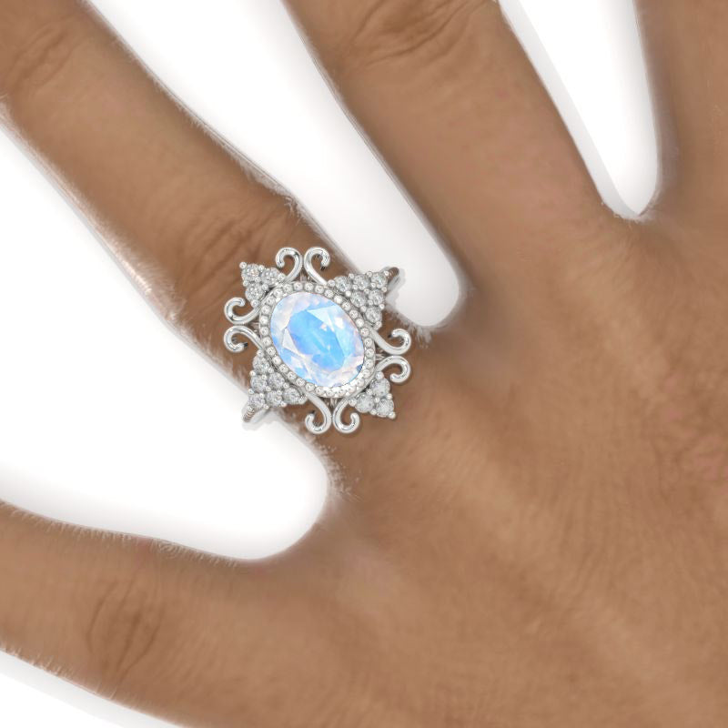 3 CT Oval Halo Genuine Moonstone Vintage Wedding Ring. 14K Solid Gold - Giliarto