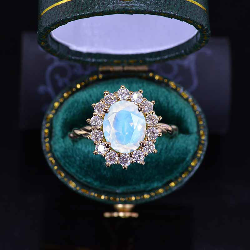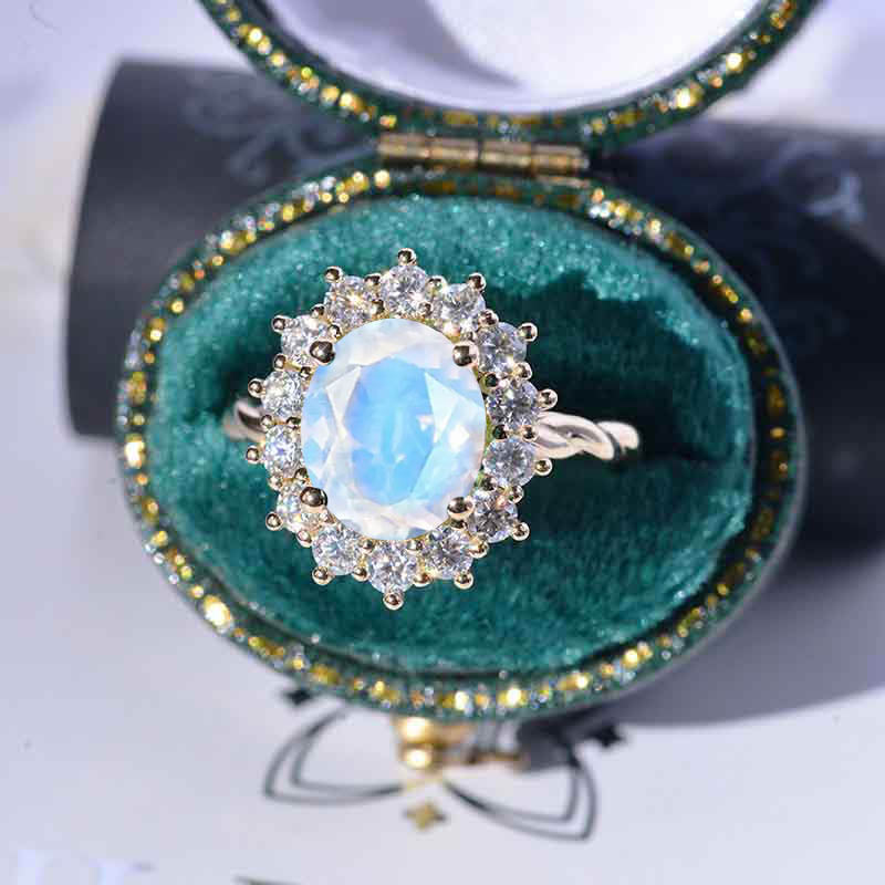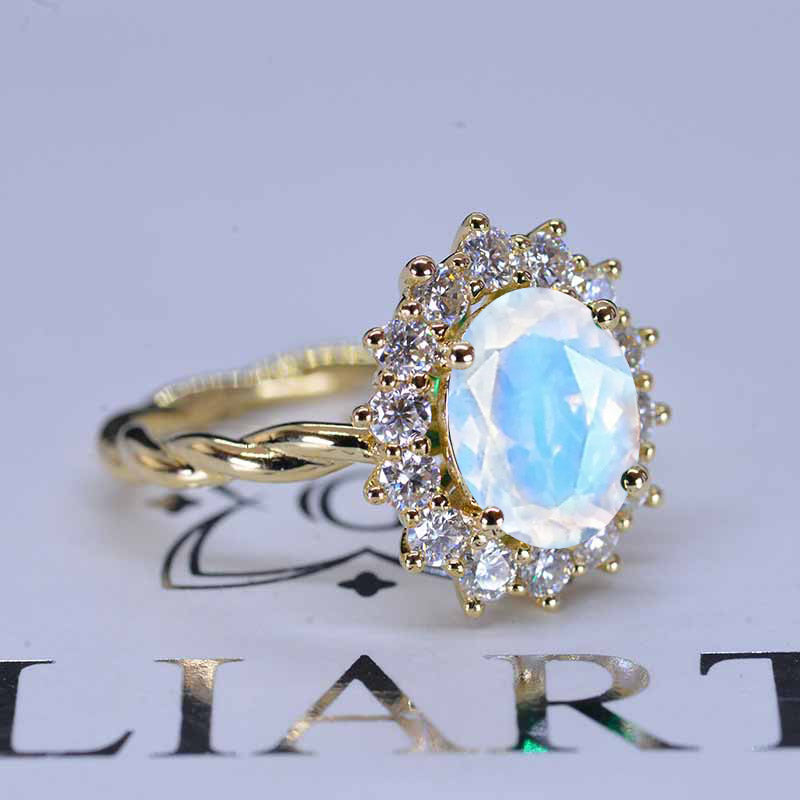 3 CT Oval Halo Genuine Moonstone Vintage Wedding Ring. 14K Solid Gold - Giliarto
