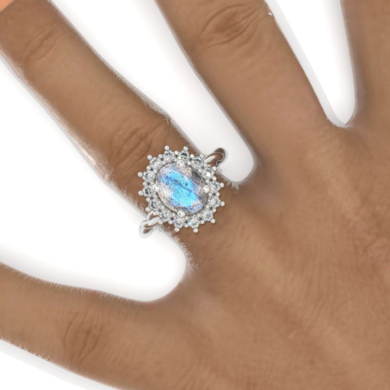 The default design option features 3Ā Carat NaturalĀ Labradorite 10x8mm Oval Center Stone,Ā VVS1-Clarity, VG-Cut, Ex-Polish, VG-Symmetry