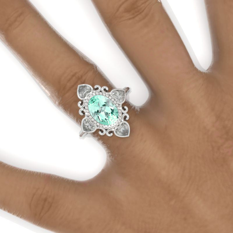 3 CT Oval Halo Mint Sapphire Vintage Wedding Ring. 14K Solid Gold Engagement Ring Anniversary Ring, Heart Halo Ring