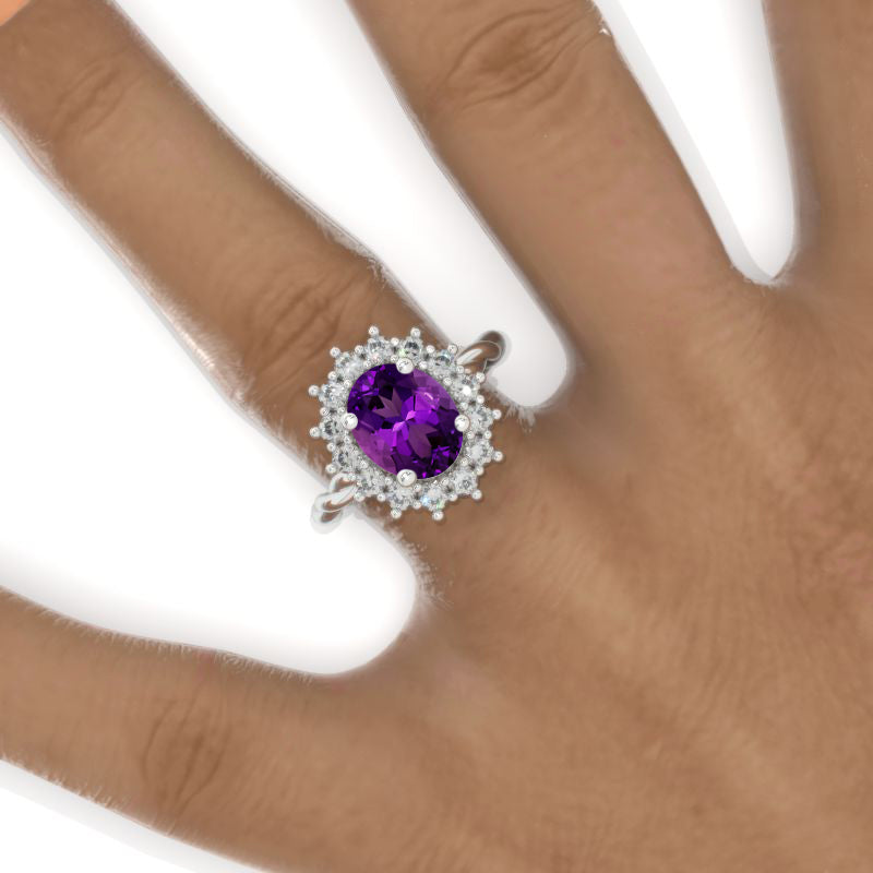 The default design option features 3Ā Carat Genuine Natural Amethyst- AAAA Grade 10x8mm Oval Center Stone, VG-Cut, Ex-Polish, VG-Symmetry