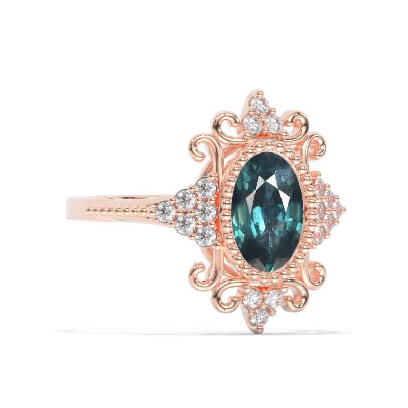 3 CT Oval Halo Teal Sapphire Vintage Wedding Ring. 14K Solid Gold Enga - Giliarto