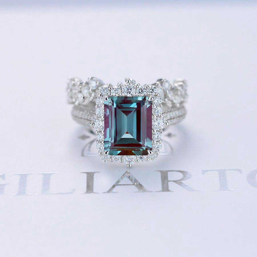 3 Carat Emerald Cut Ethically Lab-Grown Alexandrite Center Stone Engagement ring set of two rings.